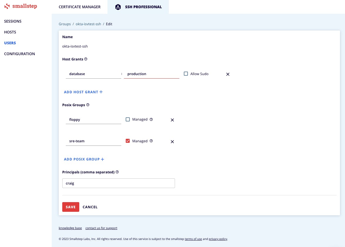 - In the example below we are adding the principal craig to certificates issued for the Group okta-isvtest-ssh.