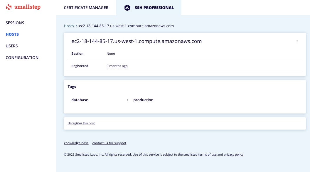 Host Tags (key-value pairs) are the pillars of our access control model. Rather than mapping people or groups directly to hosts, you'll map tag combinations to your hosts and to your user groups. First you'll put your hosts into logical groups using tags, eg. role:web or env:staging. Then, you'll grant user groups access to all hosts with a specific tag combination. Finally, you'll choose which user group tag combinations will allow sudo privileges on any matching hosts.
