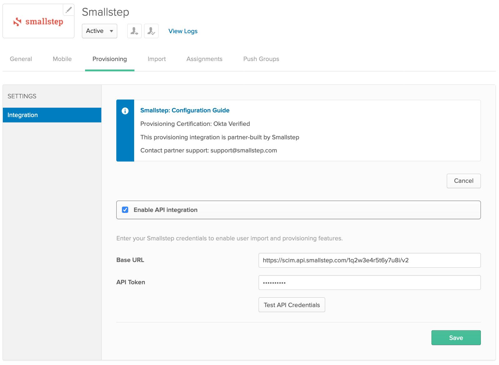 - Add and configure the Smallstep application from the Okta Application Directory, for user sync via SCIM